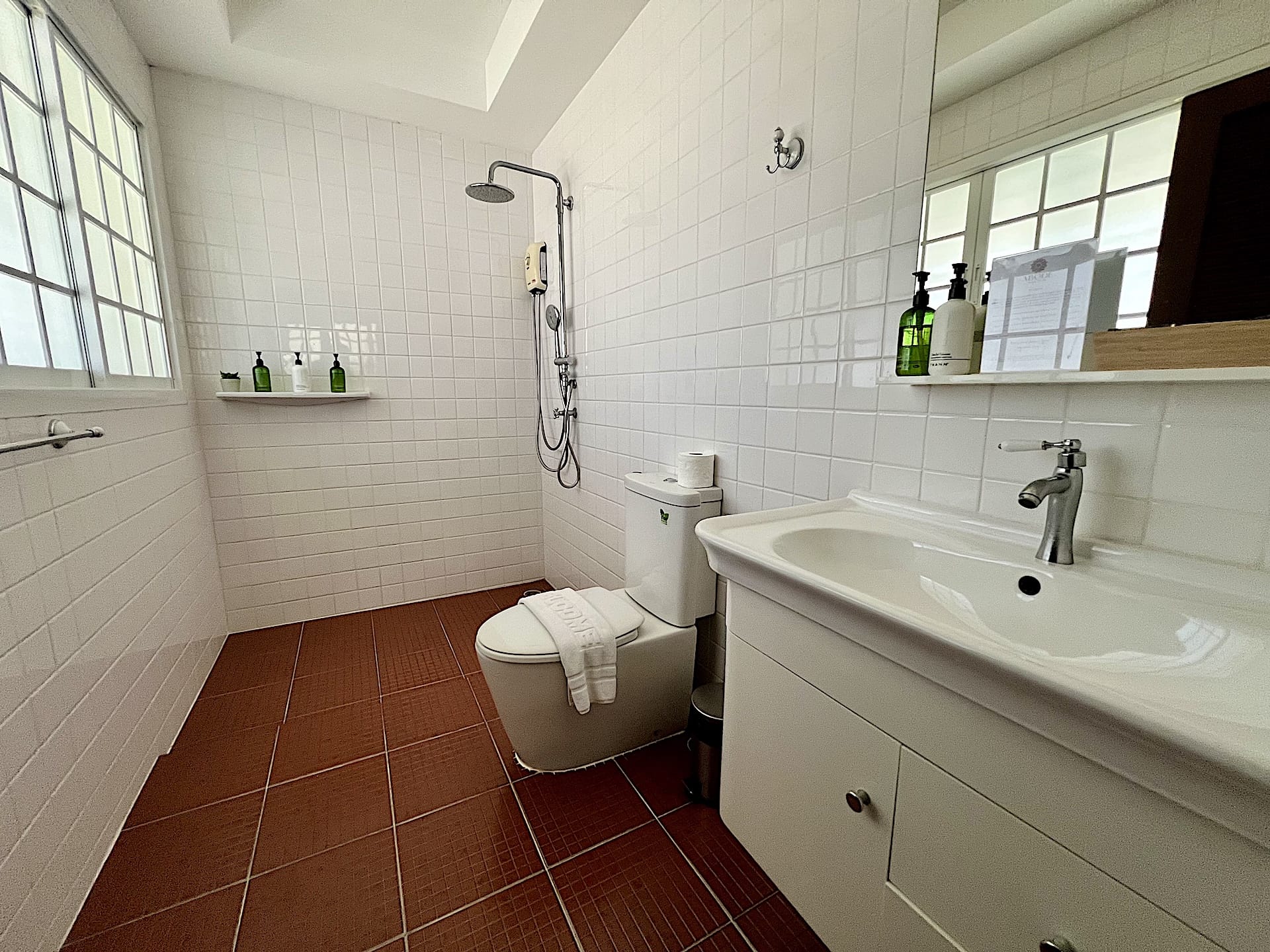 • Modern bathroom with walk-in rainfall shower