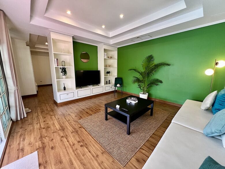 This pool-facing one-bedroom apartment is positioned in a tucked-away corner of the resort, combining a lively outlook with a sense of privacy.