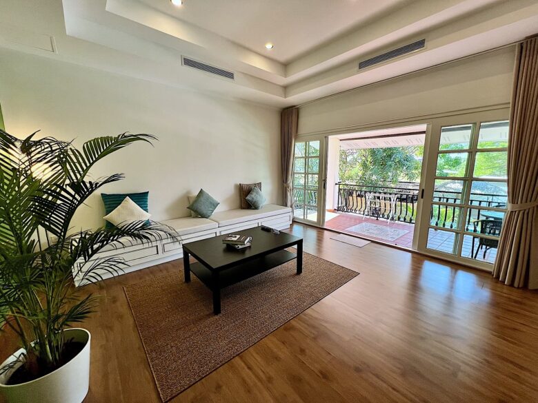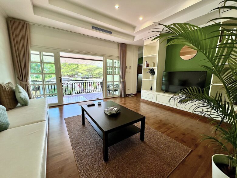 This spacious one-bedroom apartment is tucked away in a quiet corner of the resort, offering extra privacy and a peaceful garden outlook.